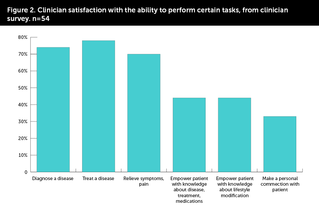 Eighty-seven percent of clinicians and staff were at least “somewhat comfortable” using medical interpreters and 76% felt they were able to overcome language barriers through interpreter use. However, only 39% were satisfied with overall medical care provided during visits when they used medical interpreters. (Figure 1) Most clinicians (70%) stated they were satisfied with their ability to diagnose and treat a disease when using interpreters; but fewer than half were satisfied with their ability to empower patients (44%) and make personal connections (33%). (Figure 2) Fifty-one percent of clinicians did not use a medical interpreter at least once in the past three months in a clinic encounter with a LEP patient due to various barriers; including high wait times to connect to interpreters, poor quality of interpreter phone connection, and patients’ preference to use family/friend as interpreter. (Figure 3)