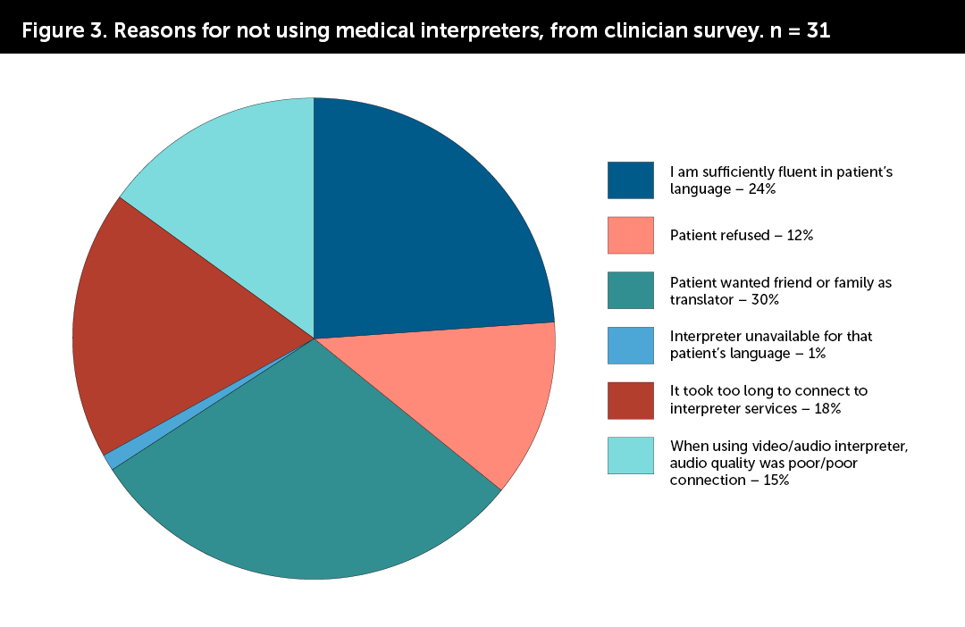 Provider focus groups and surveys helped identify specific challenges with the logistics of interpretation, including technical issues related to interpreter devices, interpretation accuracy, and time pressures. (Table 2) They also underscored the need for more video interpreter devices, which were perceived as supporting better quality interpretation than audio-only devices. It is also important to highlight that a significant number of clinicians (30%) cited patient request for using a family member/friend as an ad hoc interpreter as the reason for not using a trained interpreter. Eleven percent of patients also stated they used a family member/friend as an interpreter in the previous year. It would be interesting to delve into the degree to which time delays connecting to interpreters, poor audio quality, and inaccuracy of interpretation influenced these patients’ decisions.