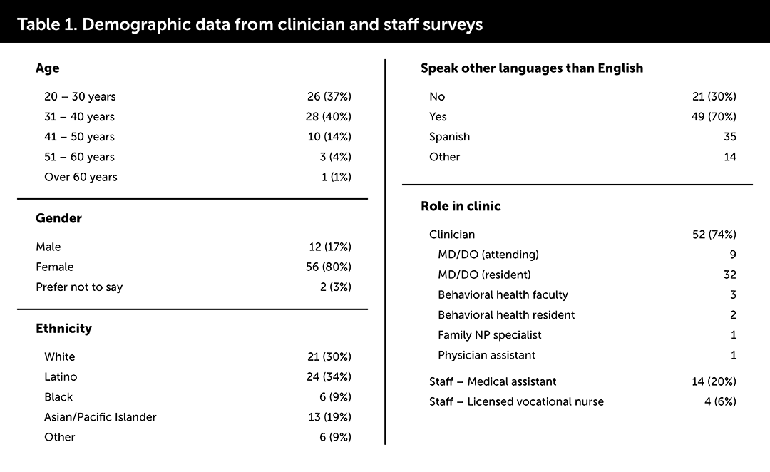 Of the 70 clinicians and staff who participated in the surveys, 52 (74%) were clinicians,14 (20%) were MAs, and 4 (6%) were LVNs. Twenty-four (34%) reported using medical interpreters for one to five clinic encounters in the preceding three months, and 20 (29%) for more than 10 encounters. See Table 1 for additional demographic information.