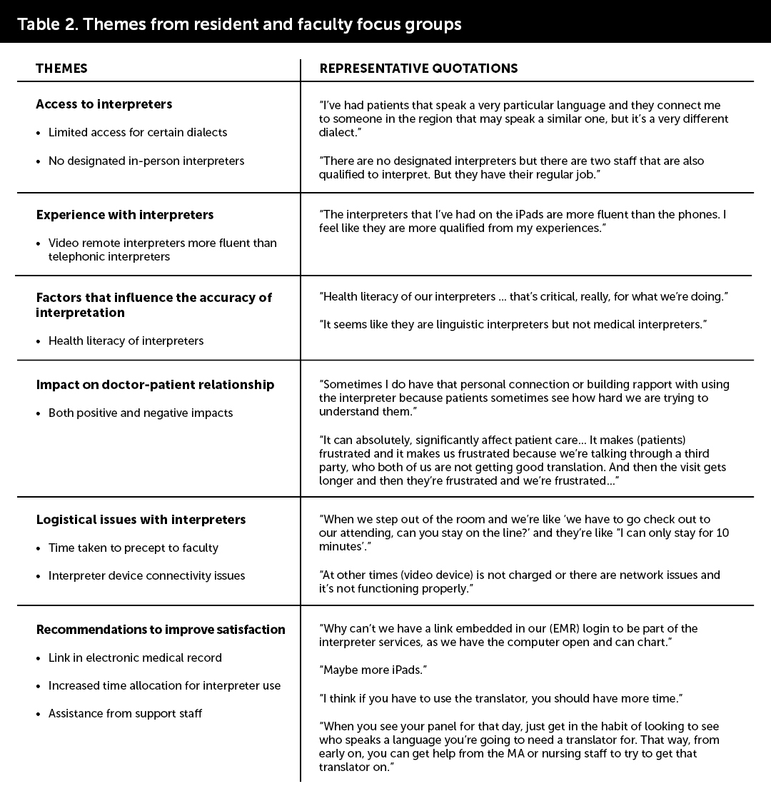 Eight family medicine resident physicians participated in the resident focus group and eight family medicine faculty participated in the faculty focus group. The focus group discussions unveiled several critical themes on provider experiences when using medical interpreters at the Family Health Center (FHC) clinic.